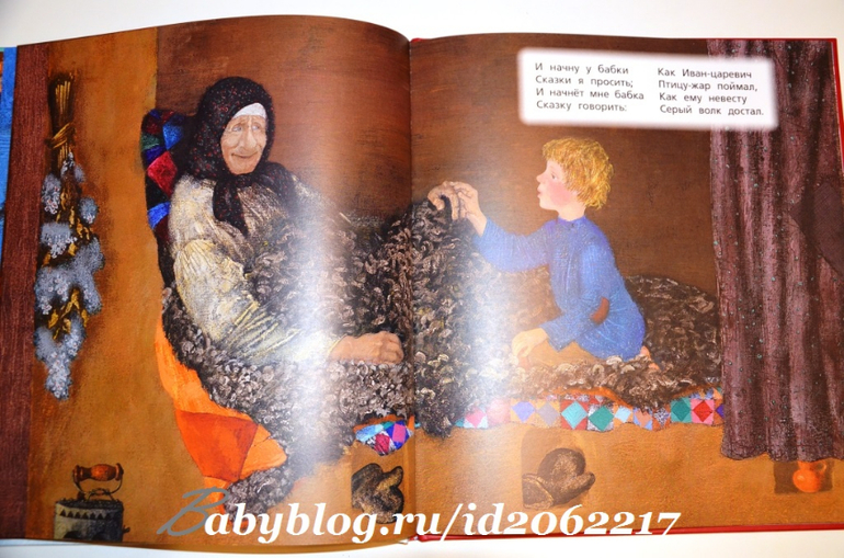У нас нет бабушки с сельским домиком, и русская печь, прялка, лоскутные ковры оживают для дочери только в воображении, благодаря художнику.