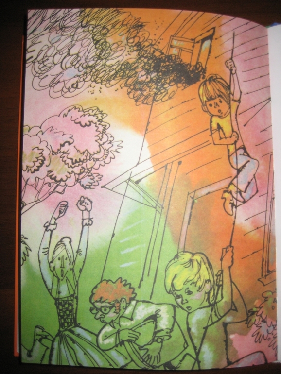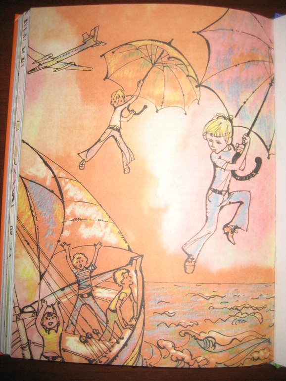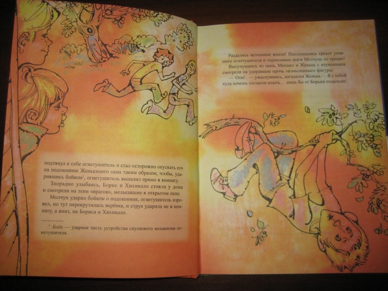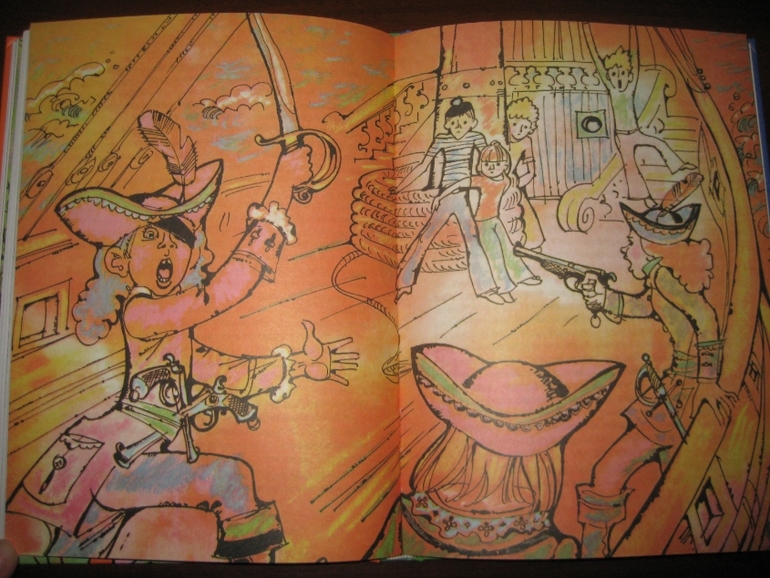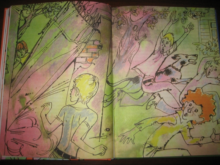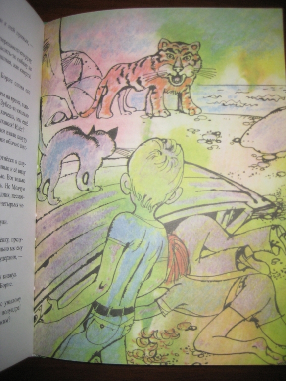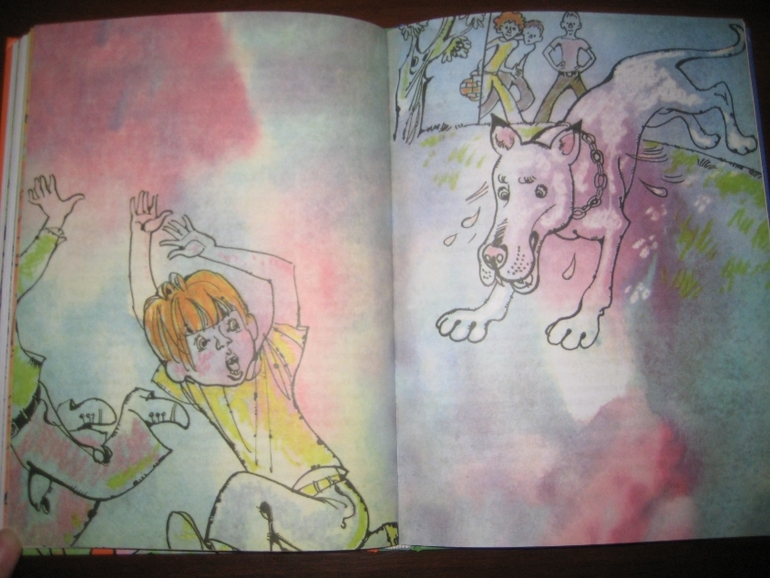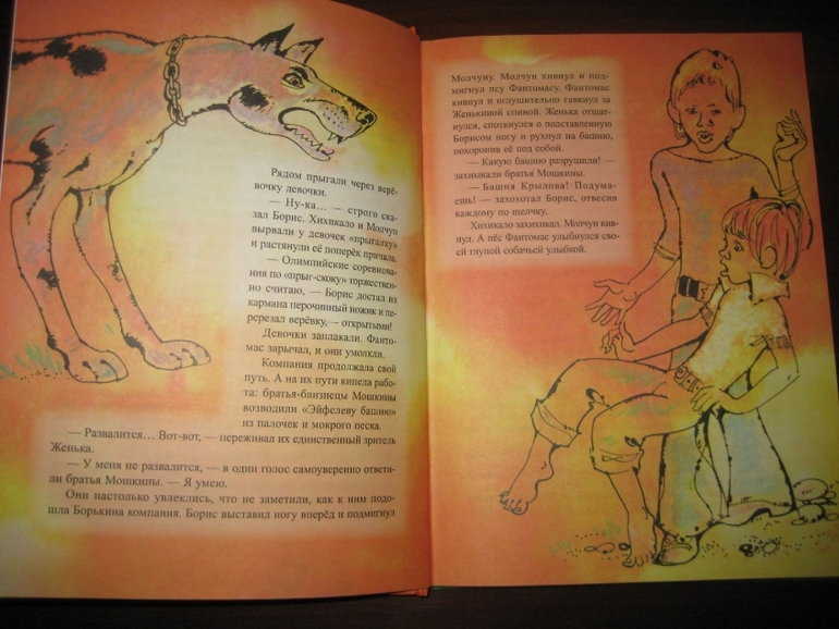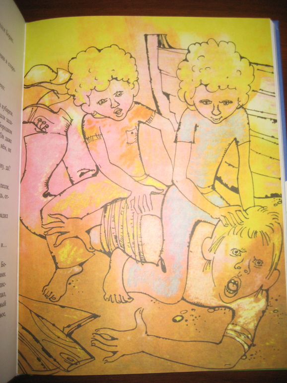 Мне понравилось сочетание достаточно лаконично оформленного текста с яркими, эмоциональными иллюстрациями. Единственное, на цветном фоне читать, конечно, не так удобно, как на белом, но это уж я, понятное дело, придираюсь :) А на белом - просто идеально :) Рисунков не так много, в среднем один на 4-5 разворотов, но они с лихвой компенсируют это своей задорностью, насыщенностью. Не видела раньше иллюстраций Спартака Калачева, очень, по-моему, забавные :) Собственно, я все их подряд отщелкала.