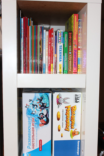 Маш,в Цветовой код не играете ещё?Я дарила своему на прошлое Рождество,в 2,6 года-сначала очень увлекся,потом какое-то время не просил сам,а недавно снова достала и была приятно удивлена-полкнижки заданий в улет сделал,потом надоело...пошел другим заниматься.И по-поводу места;у вас стены ж можно использовать ( судя по фото).Тот же самый каллакс 1на 4 повесить на стену горизонтально,или Лакк длинную полку.ИМХО