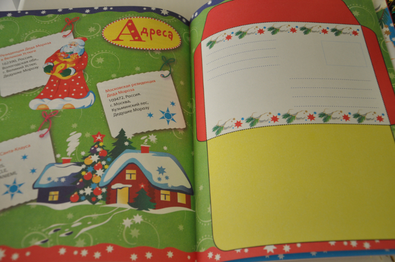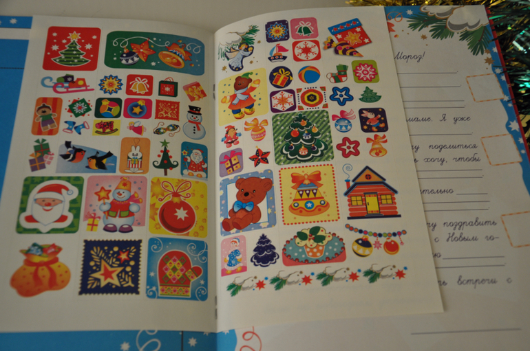 Достаточно много вариаций таких книжек, тут и бланк письма, и рисунки , которые надо раскрасить и отпраить Деду,и рассказ о Новом годе в других странах, тут еще есть разворот наклеек. 12 страниц, оффсет.