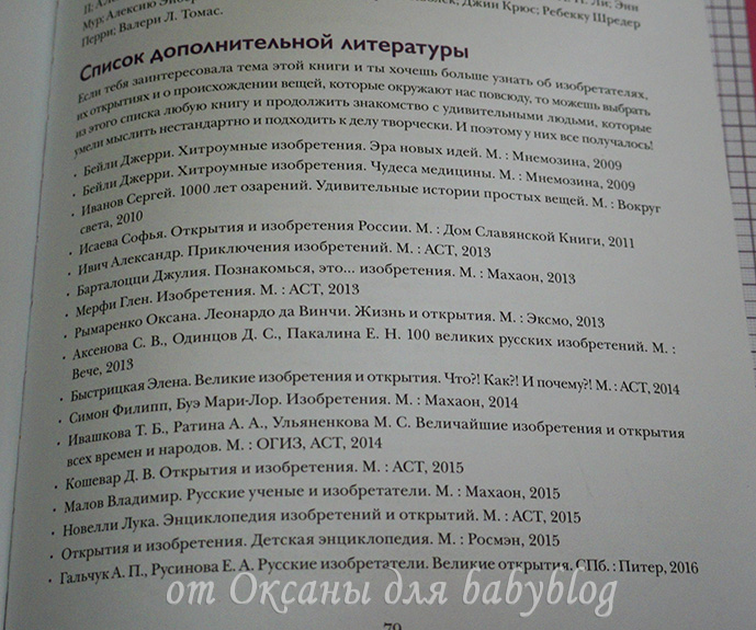 И еще две изюминки этой книги. Во-первых, она рекомендована к изданию Евгенией Шафферт, всем известным книжным экспертом. А во-вторых в книге есть интереснейший список дополнительной литературы об изобретателях и изобретениях!
