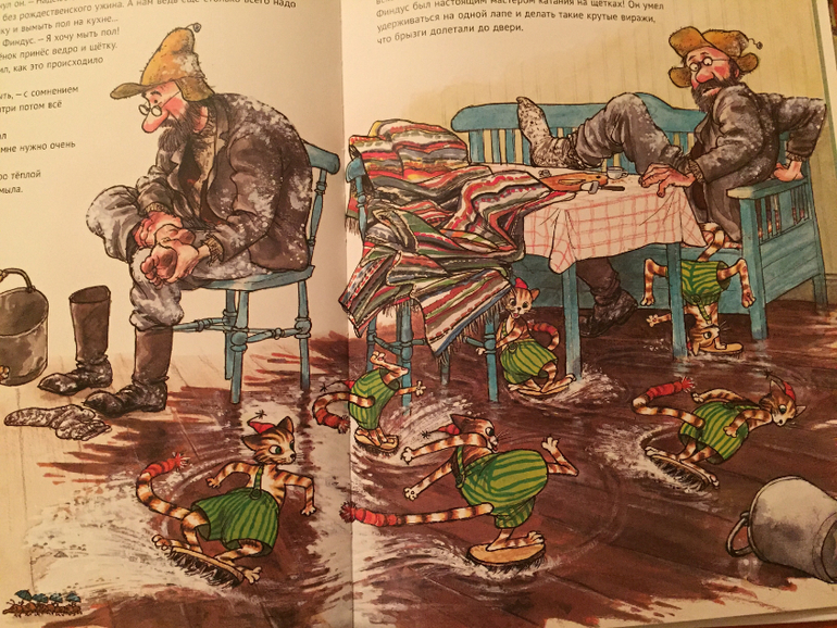 И "собираем" ветки для елки, и бедный Петсон подворачивает ногу, а Финдус норовит помыть пол на кухне по-настоящему.