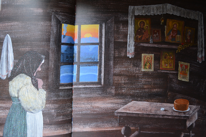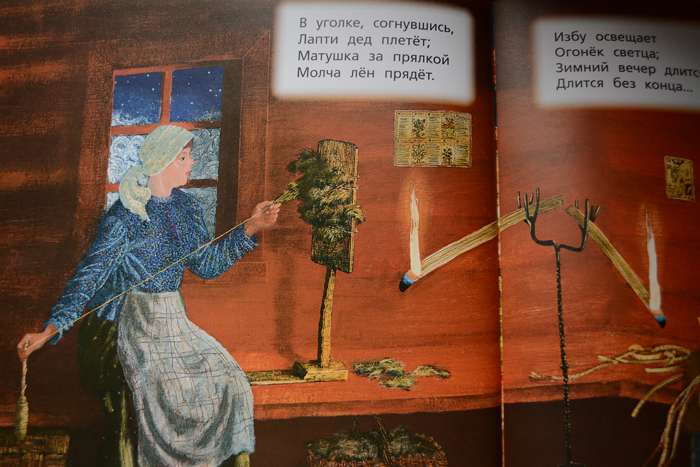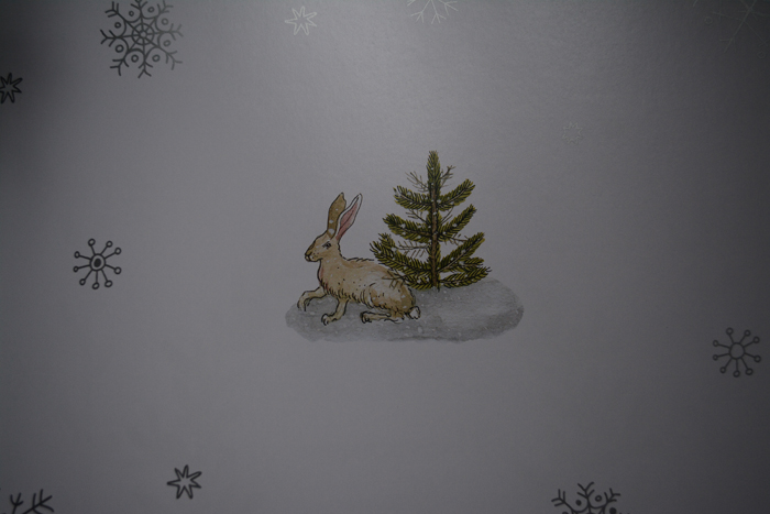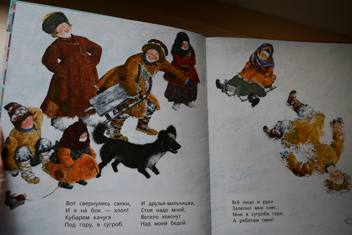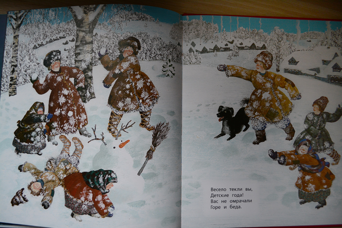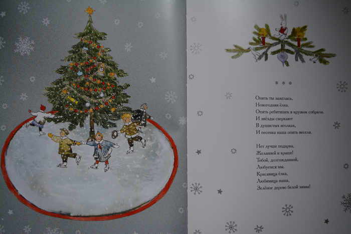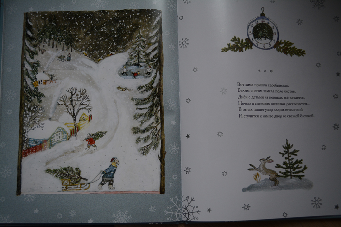 А эту книжку я полюбила заочно. Такую зиму нарисовал мне еще мой дед, когда в детстве накануне нового года подарил мне деревянную лопату с картинкой, которую сделал сам. Темно-синее небо со снегопадом, елочки и бегущий заяц.