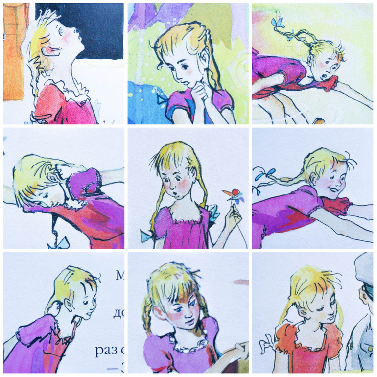 О, этот чудо-формат! Какая же она удобная и уютная. Я б ей-богу половину наших книг до такого размера почикала)) Легко держать в одной руке, брать везде с собой, валяться с ней в кровати. Приятные рисунки, запоминающиеся персонажи, много белого. Правда, на моих фото белоснежные страницы превратились в уныло-серовато-блёклые, но это пардоньте, я пока не научилась с этой бедой справляться.