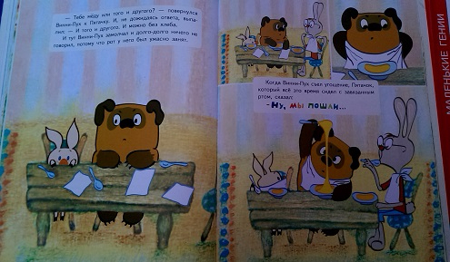 Для меня это книга загадка. Куплена давно, дети доросли до полочки где стоят все книги на вырост. Достали Винни-Пуха и теперь читаем от корки до корки. Текст сложный, даже для взрослого, есть диалоги в которые я сама не сразу могу вдуматься, но не смотря на это, ежедневно дети несут "Пупуха" и просят читать до конца, а книга толстая 150 страниц. Мы с папой уже наизусть выучили практически все истории.