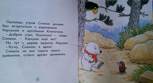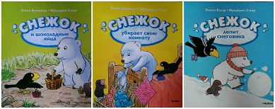 Серию про Снежка купила давно. Иллюстрации чудесные, нежные. Текста мало, но не скажу что он элементарный. Любовь к белому медвежонку началась с книги "Снежок играет в прятки". Все дети знают что такое ку-ку. Потом достала всю серию, и мне на чтение приносили маленькую стопочку историй. Первоначально текст немного адаптировала, слова и выражения встречаются сложные для двух лет, много деепричастных оборотов, когда смысл стал понятен, читаем так как есть. Я купила не всю серию, некоторые истории мне показались немного странноватыми.