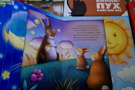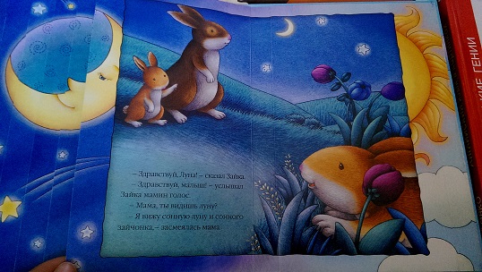 Очень спокойная книга на ночь. История про маленького зайчика, который шел с мамой с детской полянки и постепенно наступала ночь. В конце зайчик зевнув, уснул и пожелал спокойной ночи Солнышку.