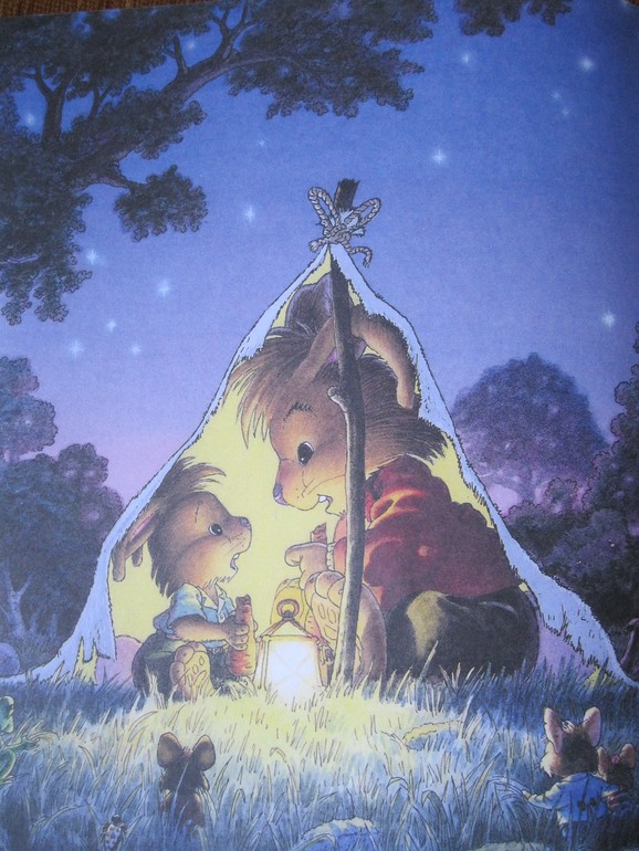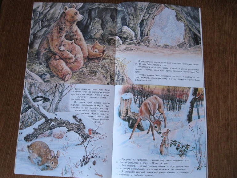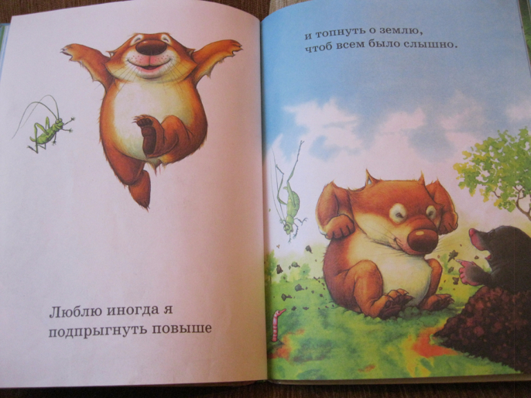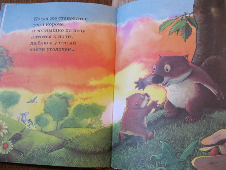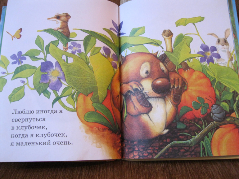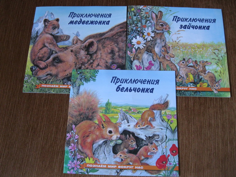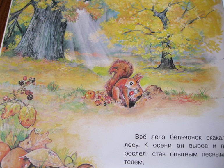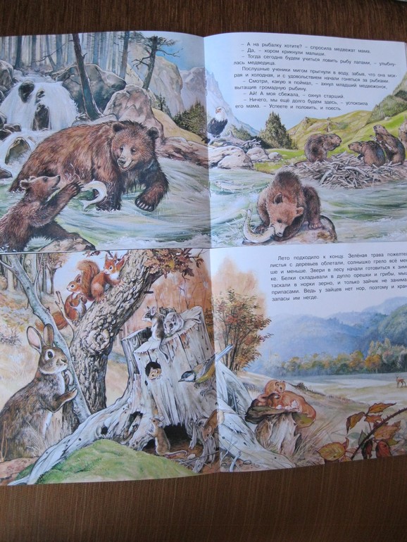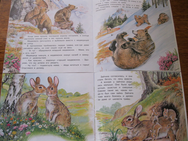 Очень приятные иллюстрации (нигде художников не нашла, указана какая-то бельгийская компания и всё), простой и понятный текст (автор И. Гурина). Истории немножко однотипные, сводятся приблизительно к следующему: малыш исследует этот мир, многому учится, вырастает и заводит своих малышей. Но каждый ведь исследует этот мир не так, как другие, поэтому нам было очень интересно соприкоснуться с миром медведей, зайцев и белок.