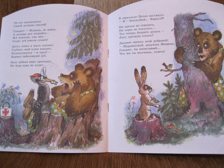 А дальше "Медвежья сказка" Усачева. Взяла я ее по двум причинам: из-за случившейся накануне истерики у стоматолога (первая встреча у нас была с врачом этим) и из-за иллюстраций Савченко.