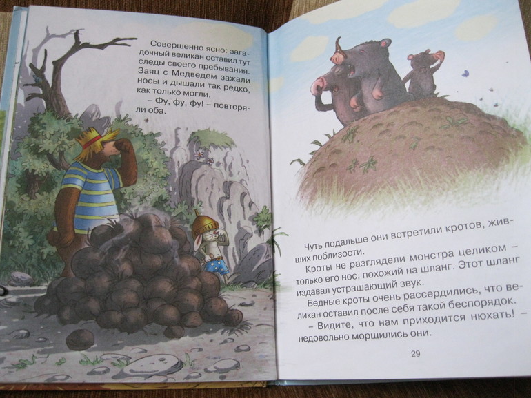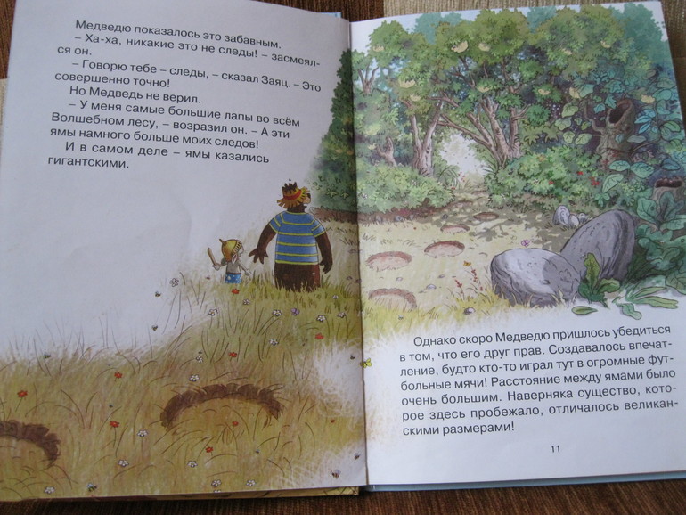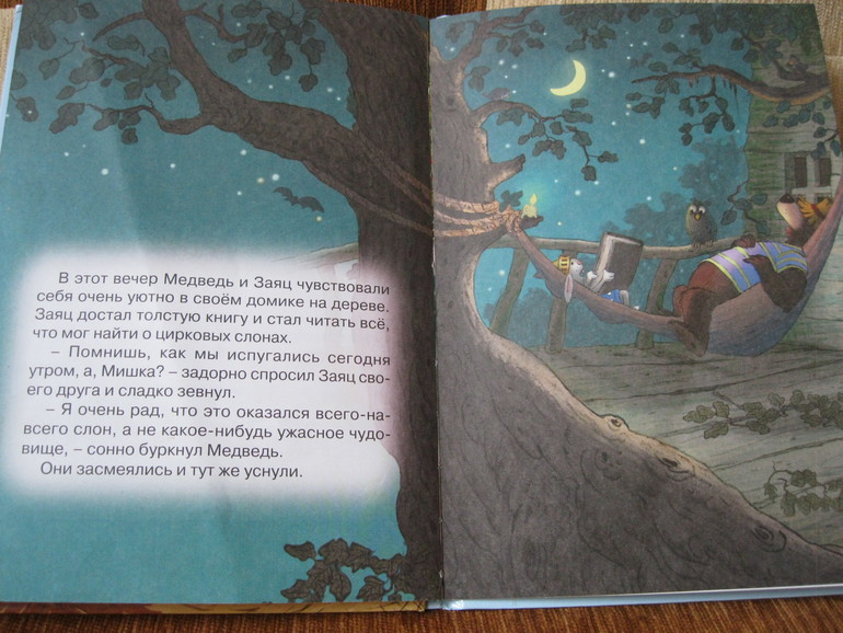 Оговорюсь, что ребенок мой историю понял не с первого раза, но попросил перечитать сразу же, долго разглядывал картинки. А потом начал бесконечно проигрывать историю о мишке и зайке, назвал своего игрушечного слона Бумбу (вы же догадались, кто великан, и без меня).