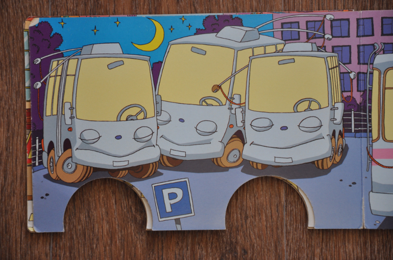 Есть у нас ещё серия книг про транспорт от издательства РАНОК. Из всего многообразия транспортных средств, выбрала дочь "Троллейбус". Вот горячо любимый разворот. Книгу поистрепала совсем :(( Колёса оторвала, конечно, зачем же они:)