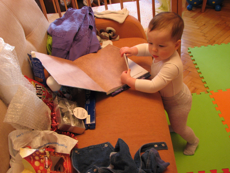 Смотрим все подарки по очереди, уже подробно, по второму разу. Я на всех фото серьезная исключительно из-за необходимости следить за тем, чтоб Сашка что-то не съел, на самом деле я в восторге)))