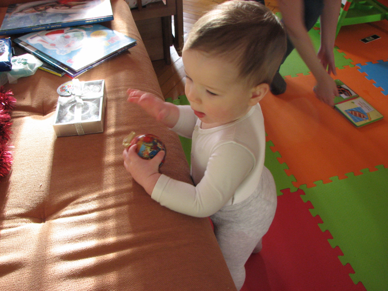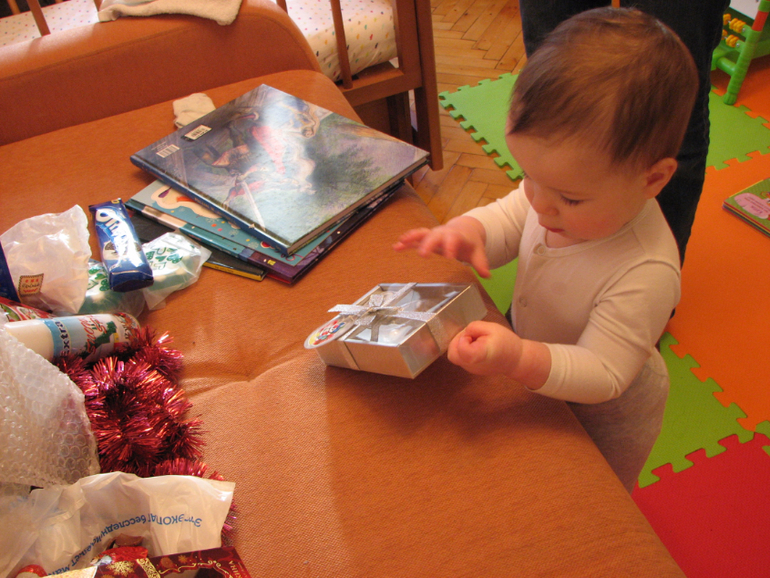 Пока бабушка кормила сына, я спокойно рассмотрела подарки и пофотографировала, пока ничего не потерялось)) Много всяких вкусняшек к чаю - о, мы с мужем без этого никуда! Штука для деланья снега - будем экспериментировать, кстати, никогда ей не пользовались, как ни странно:). Мишура теперь висит на видном месте. Остальные украшения еще не доставали, а она висит и радует нас)). На фото нет киндер-сюрприза и шоколадного Деда Мороза, они немного не выдержали поездки (но книжки не пострадали от шоколада, уф), так что мы их съели без фото.