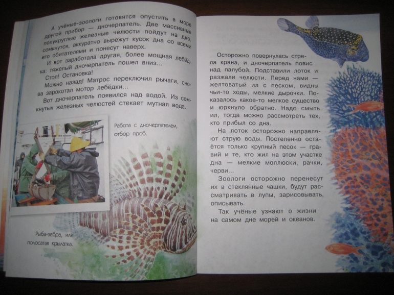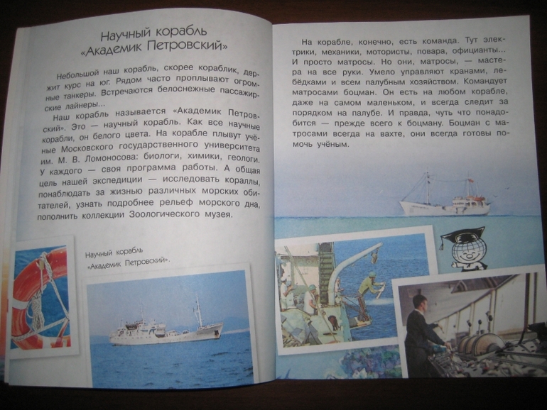 Конечно, эта книжка заинтересовала, точнее, заинтриговала нас больше всего, мы ожидали увидеть красивейший подводный мир, с причудливыми, раскрашенными в самые необыкновенные цвета рыбками, морскими звездами, прозрачными медузами, губками и кораллами... Но книжка оказалась даже лучше - не просто познавательной, не просто мини-энциклопедией, где давалась бы информация о том или ином обитателе морского дна, а описанием целого путешествия на исследовательском корабле "Академик Петровский"! Корабль держал курс на юг и работал в акватории красивейшего Красного моря.