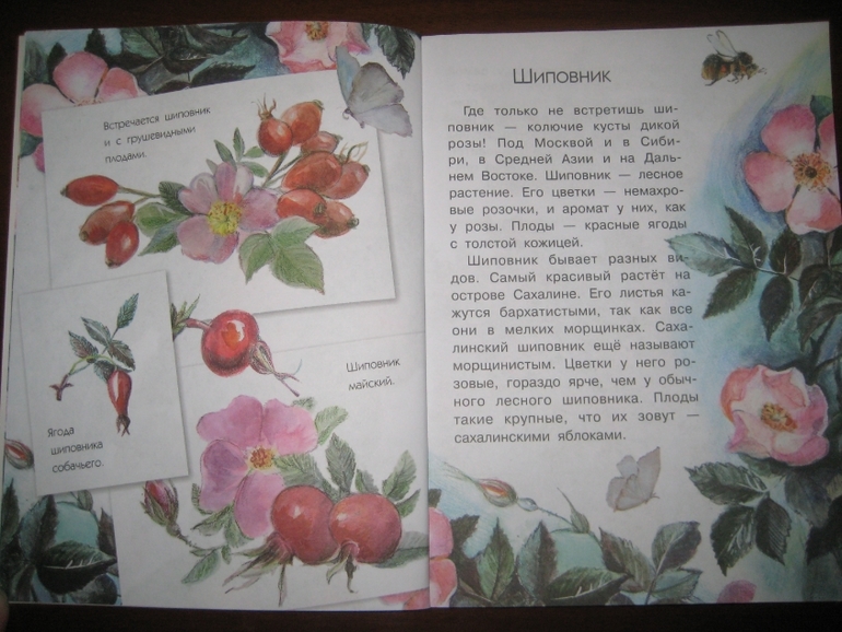 Приводится много интересных фактов: например, вы знали о том, что у шиповника, растущего на Сахалине, плоды такие крупные, что их зовут сахалинскими яблоками? А о том, что у черемухи на Дальнем Востоке листья разной формы? Снизу - округлые, выше - овальные, на самом верху - остроконечные. На Дальнем же Востоке растет боярышник, цветки которого пахнут селедкой :)