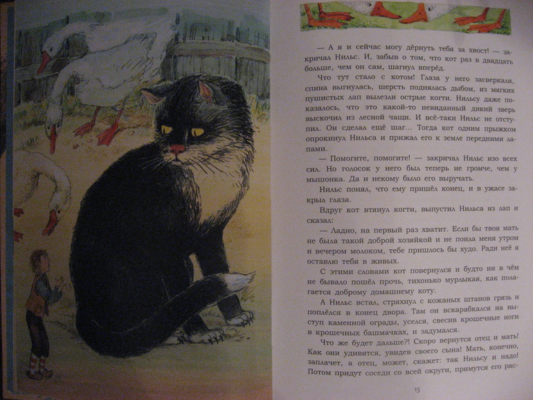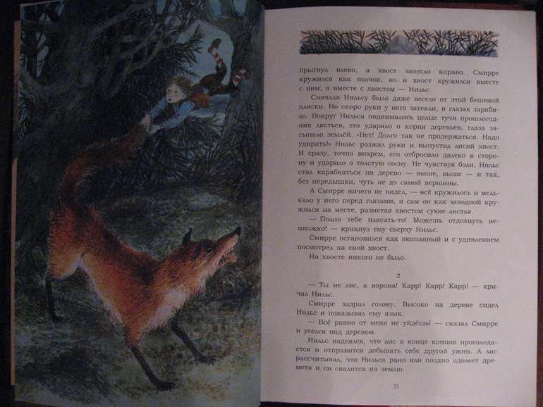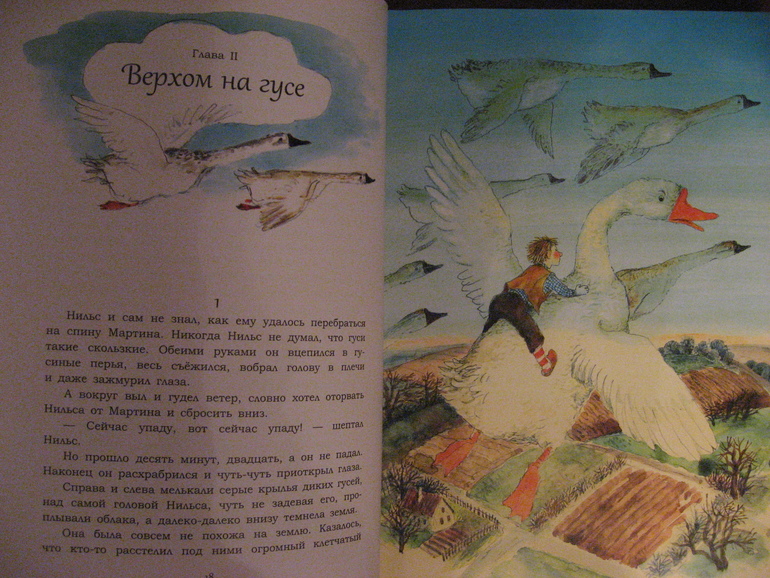 В детстве эта книга прошла мимо меня. И мимо нашего папы. И, покупая её дочке, я ориентировалась на обожаемый мною и ею тоже советский мультфильм про заколдованного мальчика. Но это разные истории! Впрочем, как всегда). Большое, просто огромное, спасибо сообщникам ДК за то, что подсказали именно пересказ этих переводчиков, а не дословный перевод! Книга просто восхитительна. Ничуть не утомляет. Читается на одном дыхании. Когда начали, опасалась, что всё же не совсем по возрасту ребёнку (4 года 9 мес.), и будет неинтересно. Но ошиблась. Слушала, просто затаив дыхание, и очень переживала, когда Нильс или его друг Мартин попадали в переплёт. Особенно страдала, когда читали историю о том, как Мартин чуть не угодил в суп, и про удачника и неудачника ("Мама, как же жалко Неудачника, ведь у него больше нет его книги! А как же теперь Удачник расскажет Неудачнику, что потерял все его листочки? Что же делать? И как же Нильс им поможет?").Искренне хохотала над непонятливым Нильсом, когда тот не мог сообразить, о чём галдят бельчата: дирле-тирле, тирле-дирле, и только потом разобрал, что Тирле - это бельчонок, который выпал из дупла. И немного, "совсем чуть-чуть" вначале побаивалась Бронзового. Очень впечатлилась историей про подводный город, задавала много вопросов, но, по-моему, так и не уложилось у неё в голове, как это город со всеми жителями уходит под воду, а потом появляется снова. Ну и что ж: пища для размышлений и фантазий).
