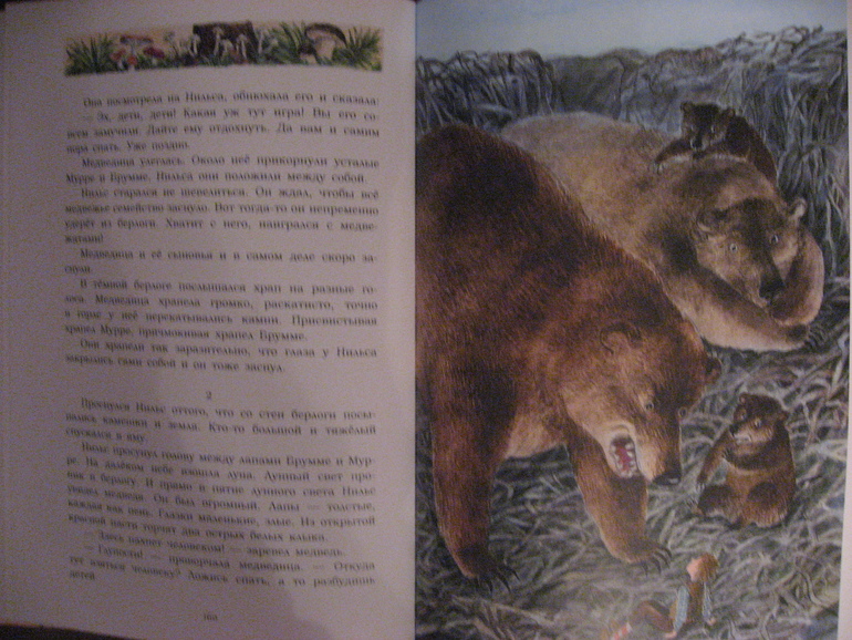 А какие там чудные иллюстрации! Хотя Соня уже вполне слушает тексты без иллюстраций, но если таковые есть и они кажутся ей интересными, она буквально утыкается в них носом, и не даёт читать дальше, пока не рассмотрит). Так было и здесь. Краем глаза заметив картинку на очередном развороте (они здесь не везде есть), она прямо-таки набрасывалась на неё, а потом показывала мне (или папе) детали: "Смотри-смотри!" А после каждого очередного вечернего чтения, получив книгу в своё полное распоряжение, ещё минут 30 рассматривала картинки и рассказывала по ним (и без них тоже) свои, не менее занимательные ))), истории про Нильса (каждый раз хочу тихонько поставить камеру, когда она остаётся перед сном один на один с книгой, и всё забываю - целый пласт культуры потерять ведь могу!).