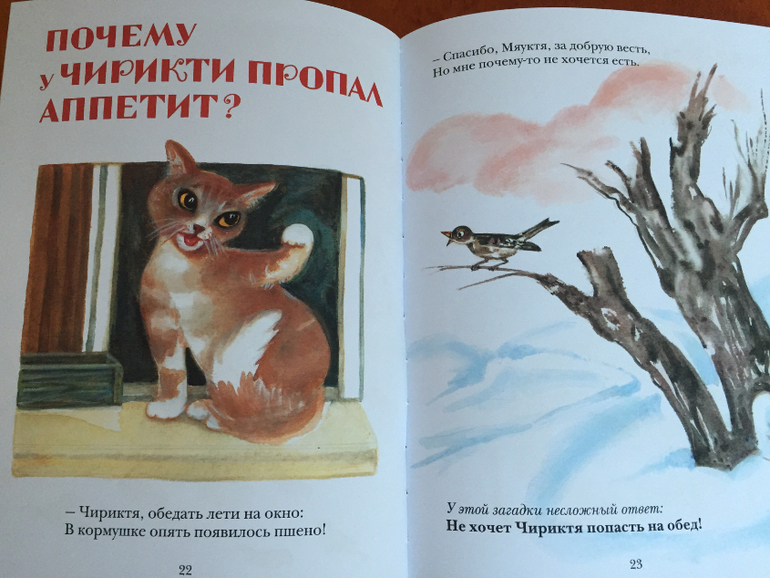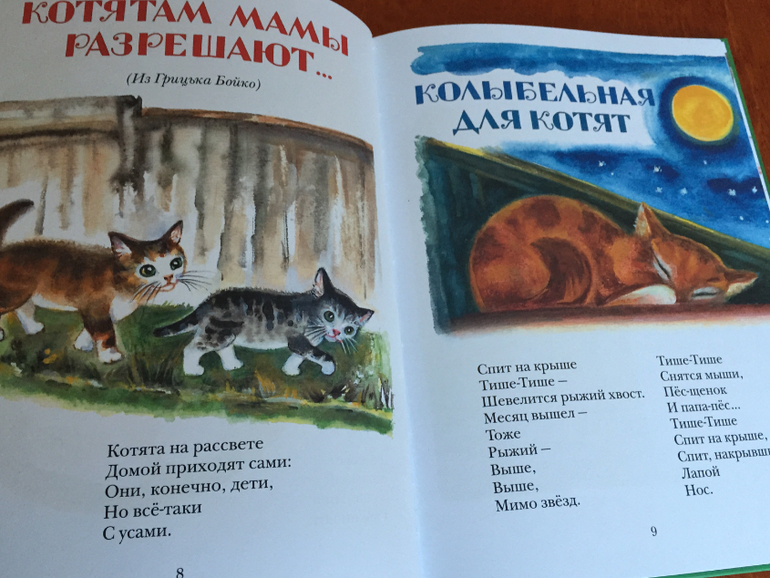Заказывала, польстившись на цену, понимая, что как раз эта книга не является самой необходимой для нас покупкой. Книжка-то хорошая, но нам бы ее раньше на пару лет. А сейчас, в 4 с половиной, не уверена, что она не утонет в нашем обилии стихов. Рассчитываю на любовь Олеси к кошачьим, а также на возможное самостоятельное чтение чуть позже: шрифт в книжке крупный, бумага белая, стихи короткие, для начинающего читателя то, что нужно.
