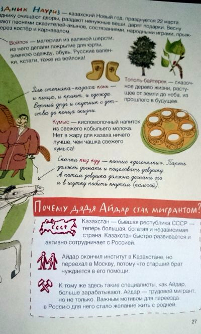 И я очень, очень рада, что издательство "Самокат" выпустило книгу, которая этому помогает. Книгу о том, что люди, которые в Москву приехали, тоже люди, о том, что они так же работают, радуются, помогают, много чего умеют и знают разное интересное. О том, что некоторым некуда возвращаться. Представляю, как сложно было выбирать верные слова, искать честные, но не пугающие детей объяснения. Получилось весело и познавательно.