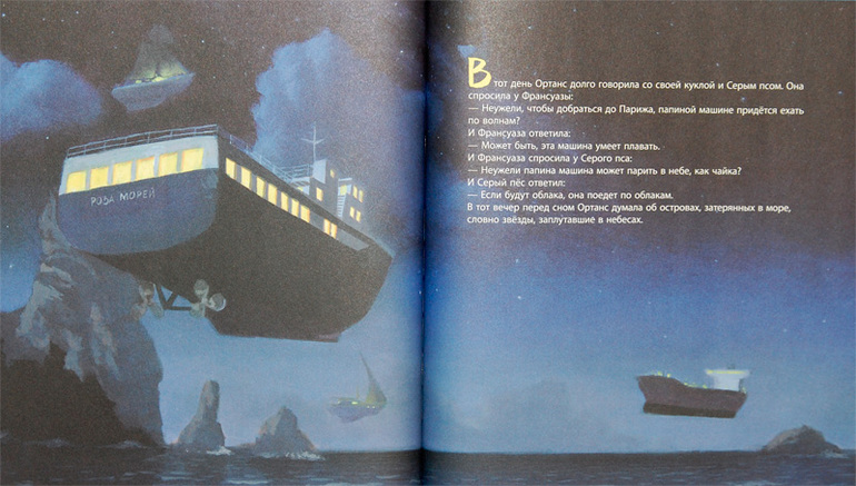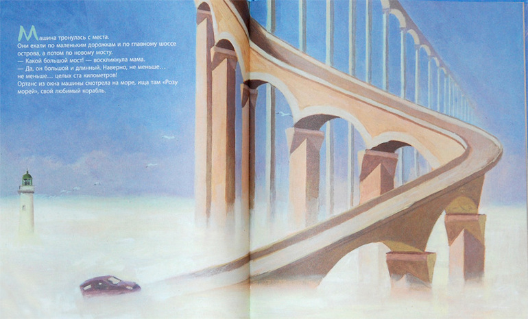 Когда девочка отправляется к бабушке и дедушке на материк, мы узнаем, что построен новый мост. Огромный, длинный, словно парящий в воздухе. Вот почему большому кораблю больше не надо приплывать на остров. Но девочка все равно ждет и ищет свой потерянный мир. Грандма и грандпа живут в Париже, быть в Париже и не посетить Эйфелеву башню ? И вот тут кульминационный момент, о котором в тексте нет ни слова. Он должен быть словно удар хлыстом.