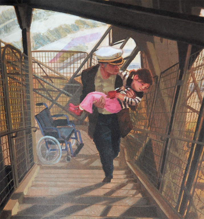 Эта картинка должна всё объяснить. И понятно, что в 3 года, да и в пять может быть этой кульминации не будет. А в ней сильный момент книги. Мы не должны жалеть девочку. Ведь мы не жалели ее до сих пор? Мы вообще не думали, что с ней что-то не так. Вот и она не думает. Она ищет свой мир. И находит его в мечте. На высоте птичьего полета ей кажется, что она видит его, свой потерянный мир, свой корабль и вспоминает об оставленном друге - собаке. Надо ему рассказать, что с кораблем все хорошо. И это все-таки оптимизм. Да, он не такой прямой как в цветике-семицветике. Махнул лепестком, вскочил и побежал. Он внутри из-за того, что ты не такой до тех пор, пока ты об этом думаешь.