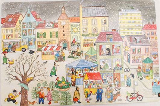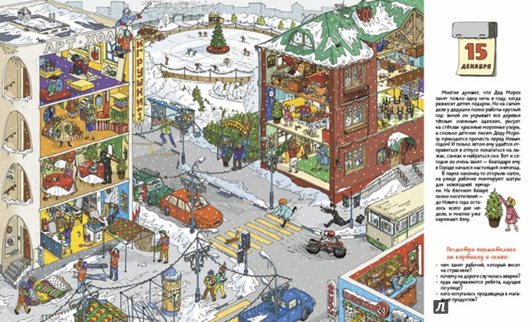 Мы, как любители книжек-картинок не могли пройти мимо, кажется, первого российского "виммеля", да еще и про Новый год. Про наш русский Новый год. С Дедом Морозом, утренниками в детских садах, корпоративами и праздничным ажиотажем в магазинах. День ото дня город преображается, у каждого героя есть своя история. В конце все весело празднуют Новый год, а 1-го января на улице ни души. Кроме дворника, который еще долго будет разгребать мусор на тротуарах...