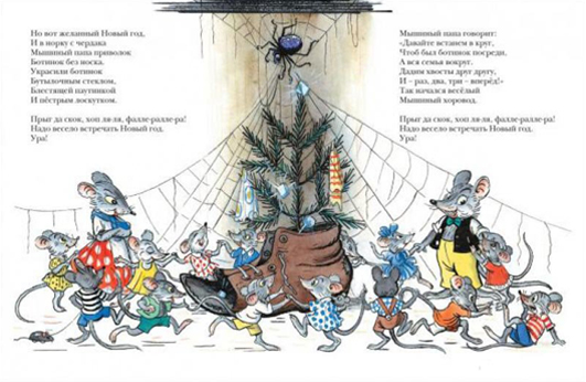 Незатейливое стихотворение про то, как мышиное семейство празднует Новый год. Каждый фрагмент заканчивается песенкой, которая больше всего в этой книге нравится Маше: "Прыг да скок, хоп ля-ля, фалле-ралле-ра! Надо весело встречать Новый год. Ура!". А еще здесь классные иллюстрации Сутеева.