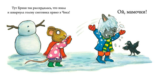 Истории про Чика и Брикки точно придутся по душе двухлеткам. Ситуации, в которые попадают главные герои, хорошо им знакомы. Так, в этой книге Чик и Брикки поспорили: кого они слепят из снега - зайчика или мышку. Дело дошло до драки))) Хорошо, что Брикки решила первой попросить прощения. Единственное, к чему можно придраться - текст. Его здесь почти нет, поэтому приходится многое добавлять от себя. Благо, что иллюстрации позволяют разыграться воображению.