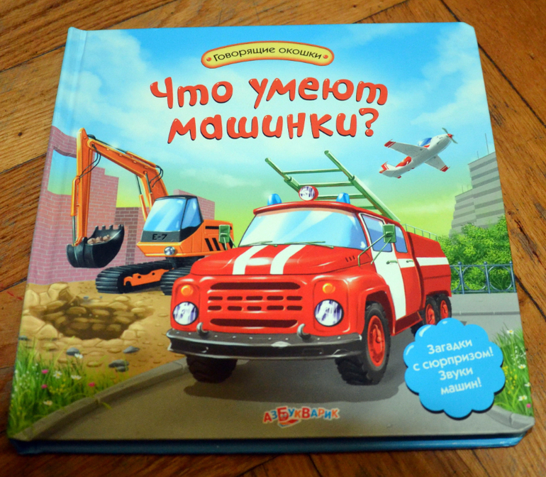 Поделюсь еще одной симпатичной находкой от Азбукварик. Книга «Что умеют машинки?» Она довольно оригинально сконструирована: звук поезда, корабля, пожарной машины, самолета, подъемного крана появляется, когда открывается разворот на странице. Работает при хорошем освещении: в каждую страницу встроен световой элемент.