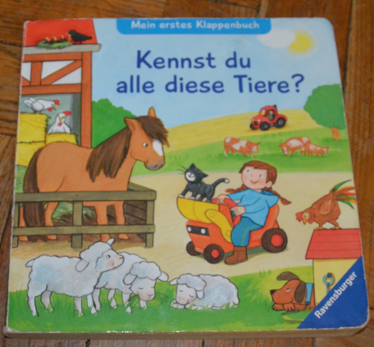 Она вполне себе традиционная в этой категории, хороша тем, что у нее страницы из плотного картона, не рвутся, не мнутся после многократного использования. И сюжеты понятны сами по себе, даже без текста (я немецким не владею). Малышу нравится узнавать на картинках животных, машины. Темы: ферма и зоопарк. Возвращаемся к ней часто. Потом будем придумывать по картинкам рассказы, отсутствие текста к этому стимулирует ))