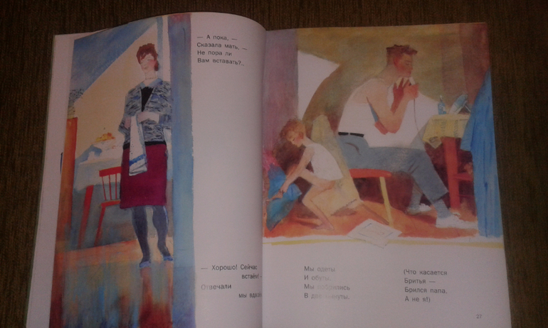 А вот это наше любимое стихотворение про папу. Обожаю, когда в субботу утром сын перебирается к нам в постель с этой книгой и папа читает "Хороший день". Вот портфель, пальто и шляпа. День у папы выходной. Не ушел сегодня папа, значит, будет он со мной.