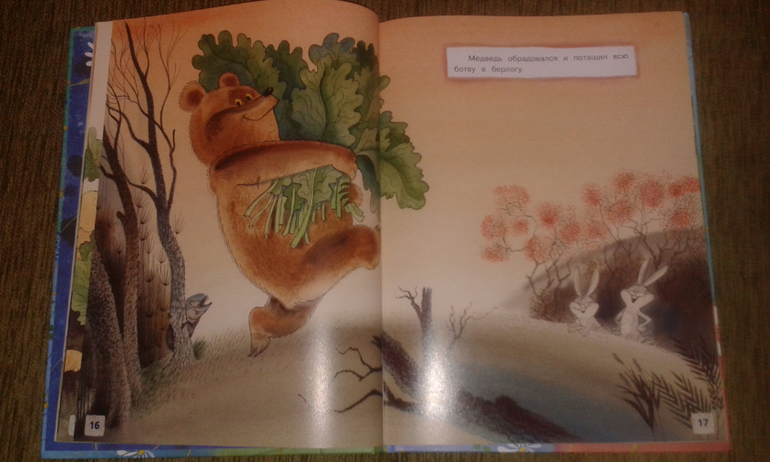 Здесь он замечает ежика и зайчиков, которые смеются над медведем с ботвой от репы.