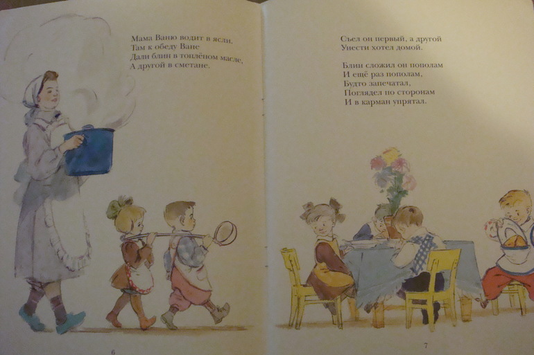 А вот эта картинка очень нравится Лизе. Говорит, что тоже так кушают в садике. А Ваня, посмотри блин прячет в карман.