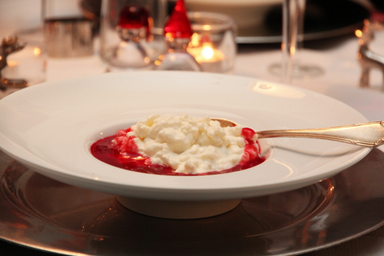 После подаётся десерт - это сладкая рисовая каша - Рискрем, но со взбитым кремом из сливок, поливается она ягодными соусом. У неё особый вкус отличается от каши на ланч.