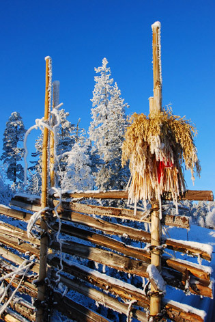 а красочные носочки вывешивают как рождественское украшение. На улице выставляют сноп для птиц.