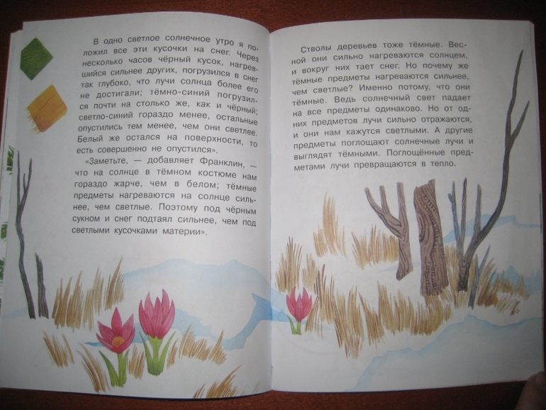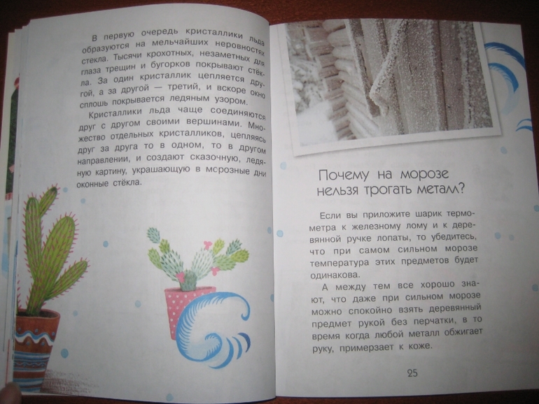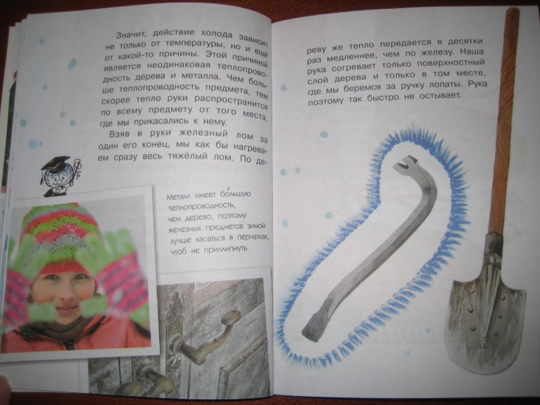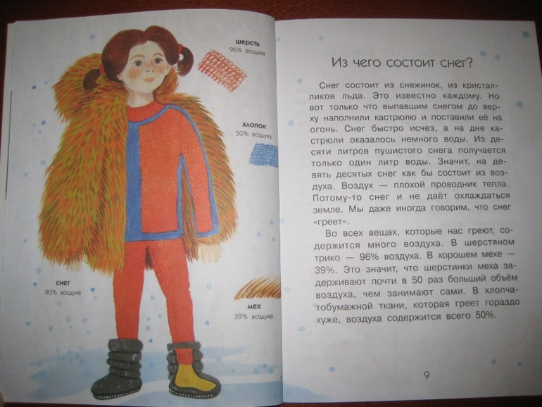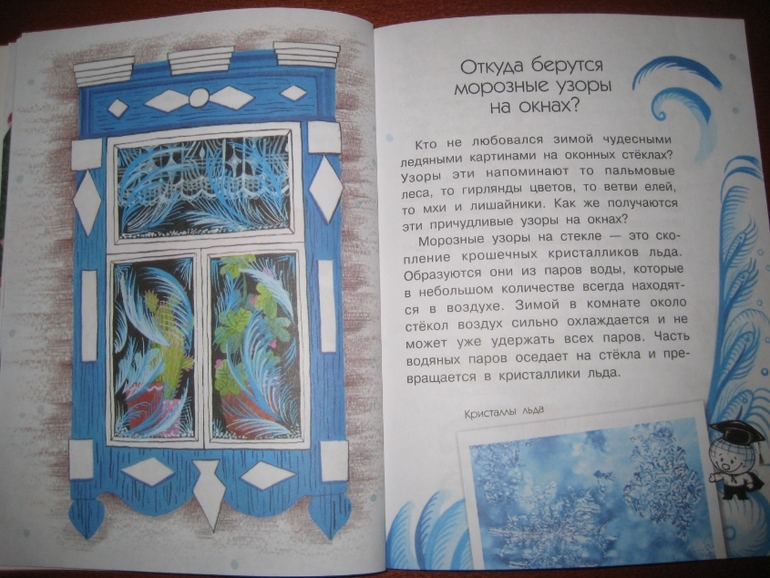 Если судить по названию книги, можно подумать, что она в основном про физические явления. Да, это так, но не только об этом. Здесь обо всем, что так или иначе связано со снегом, холодом, морозом, но есть, например, и информация о новогодней елке, о том, как по кольцам на срезе определить ее возраст, и о том, почему иногда не очень юные елки бывают такими маленькими, почему сквозь стекло солнце греет сильнее, почему весной и осенью садоводы жгут во фруктовых садах костры и т.д. Признаться, я и не думала, что тему снега и холода можно так развить :)