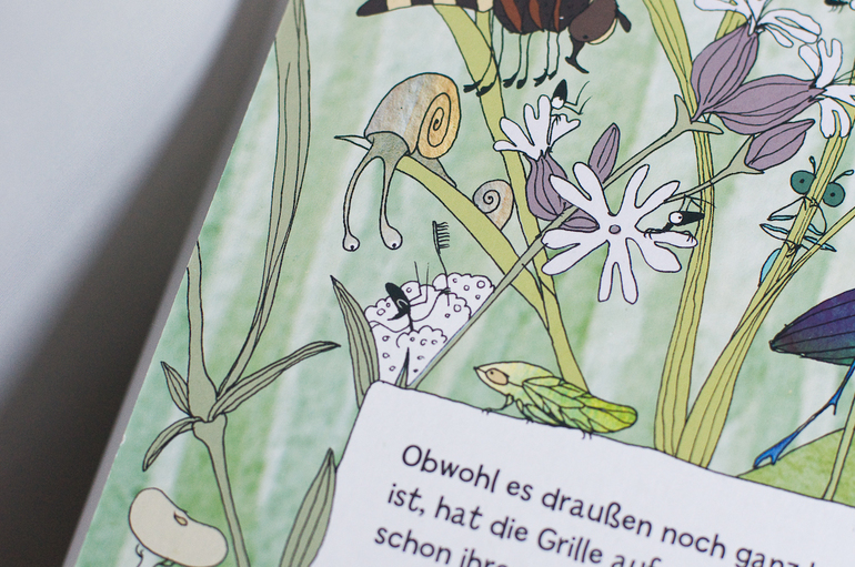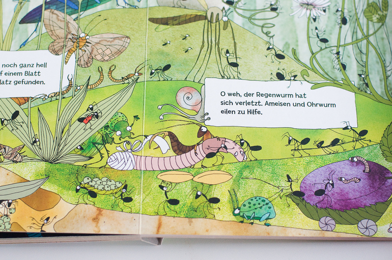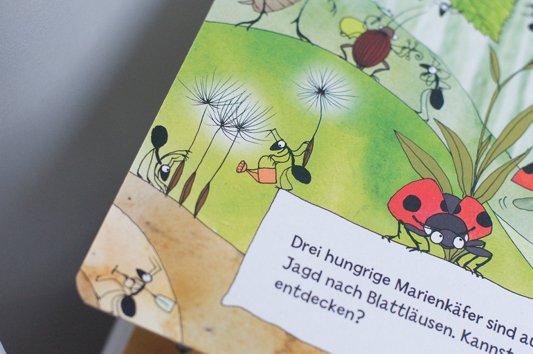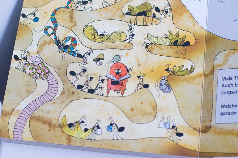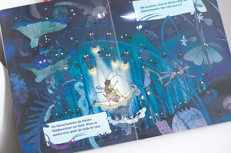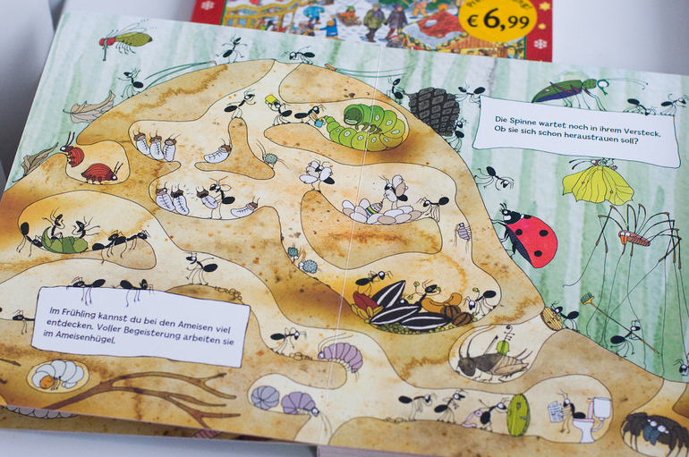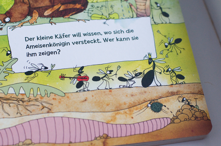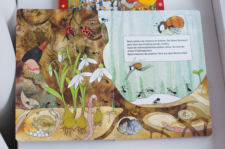 А вот о второй немецкой редкости я мечтала давно. На ней хочется остановиться чуть подробнее, обзоров об этой книге я видела, хотя пару раз мелькала. Это книга - шедевр для меня. В переводе книга называется "Посмотрите, кто ползает в лесу". Начну с того, что это экокнига. Картон из переработанной бумаги, натуральные красители, наверно, ее можно даже есть)))