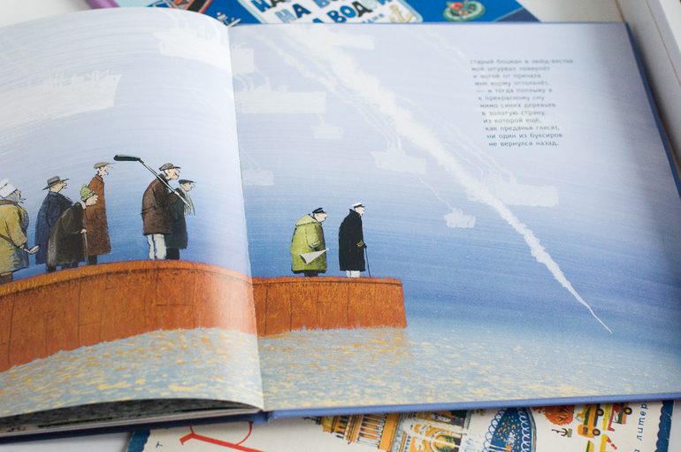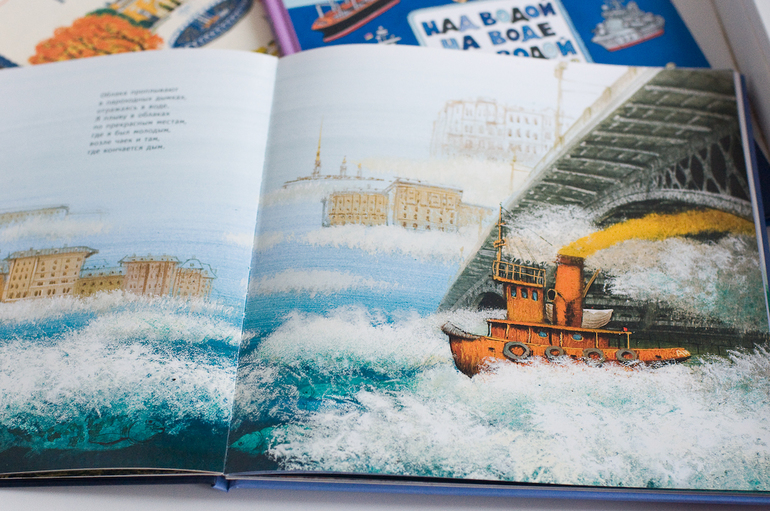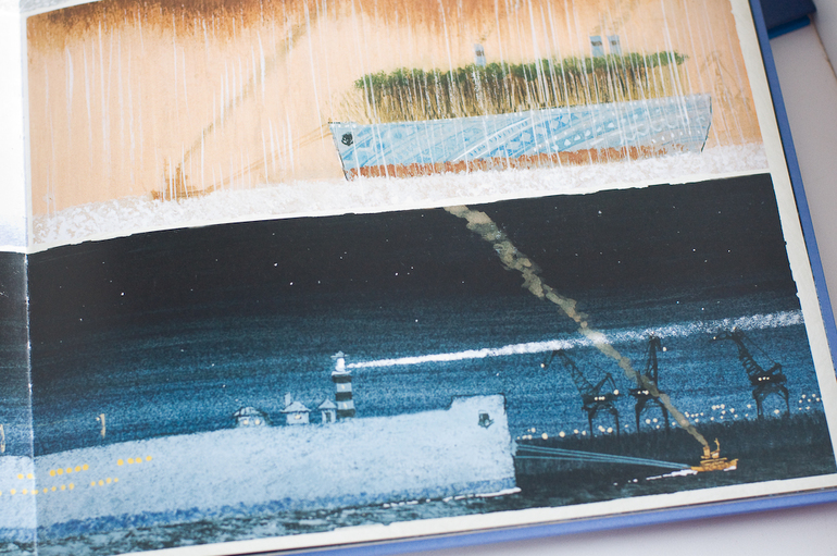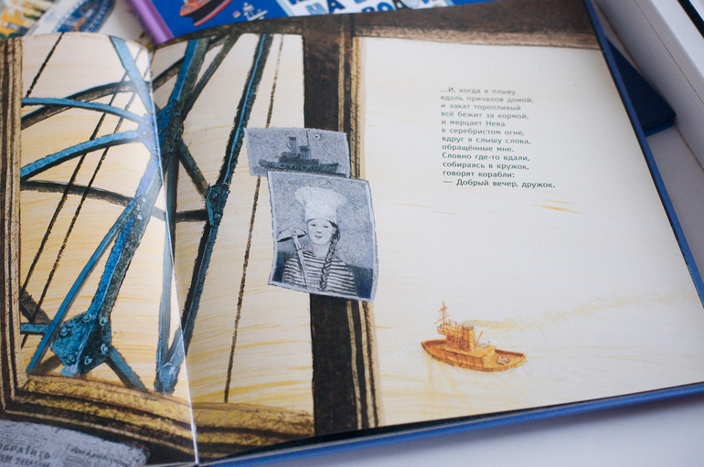 В книге десять разворотов посвященных сожительству года и реки. Какие иллюстрации все же атмосферные! Разглядываешь и чувствуешь, что уже не здесь, а где-то там на берег этой набережной, ветер безжалостно треплет волосы, а запах воды проникает во все клеточки твоей души. И корабли, корабли. И все разные, и все настоящие!