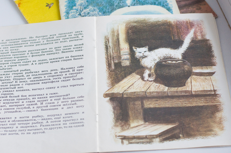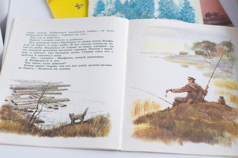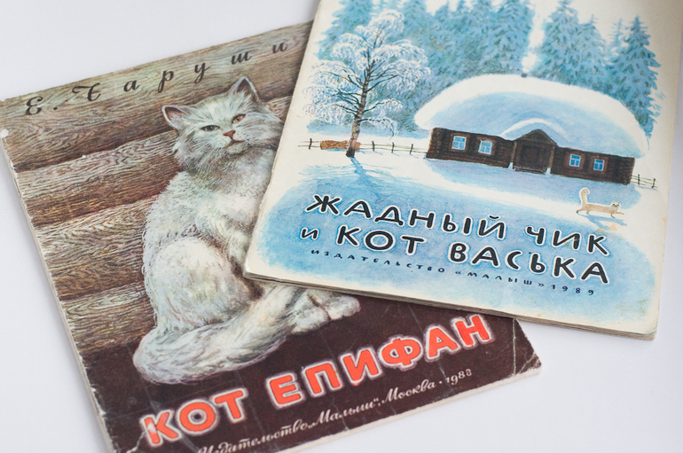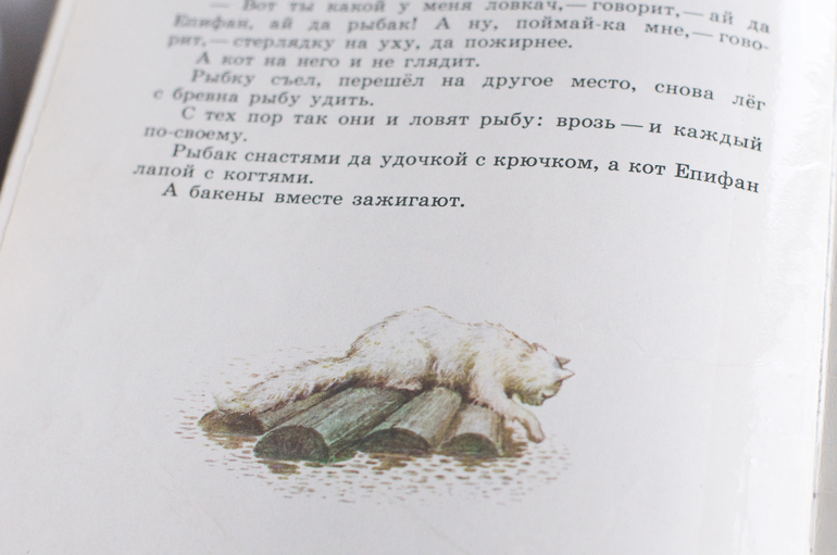 Е. Чарушин «Кот Епифан», художник С. Куприянов, 1988, изд-во «Малыш». История о том как старик бакенщик нашел у себя в доме кота, накормил, кот, не будь дураком, и остался у старика жить. Вот и рыбу сам научился ловить, и на лодке бакены зажигать со стариком стал.