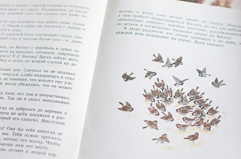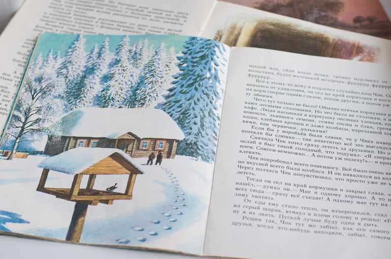 Ю.Казаков «Жадный Чик и кот Васька», художник Н.Устинов, 1989, Изд-во «Малыш». История про глупенького воробья, который не захотел делиться с друзьями своей тайной о затерянной в лесу кормушке. Поучительная и познавательная история, а иллюстрации какие. Эх, какая зима, нам бы такую! Прям ностальгия иногда накатывает по деревне, домикам, колодцам.