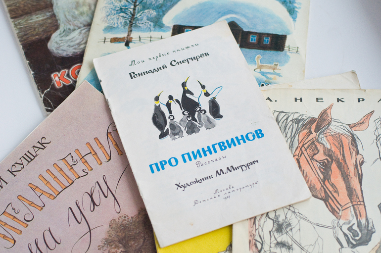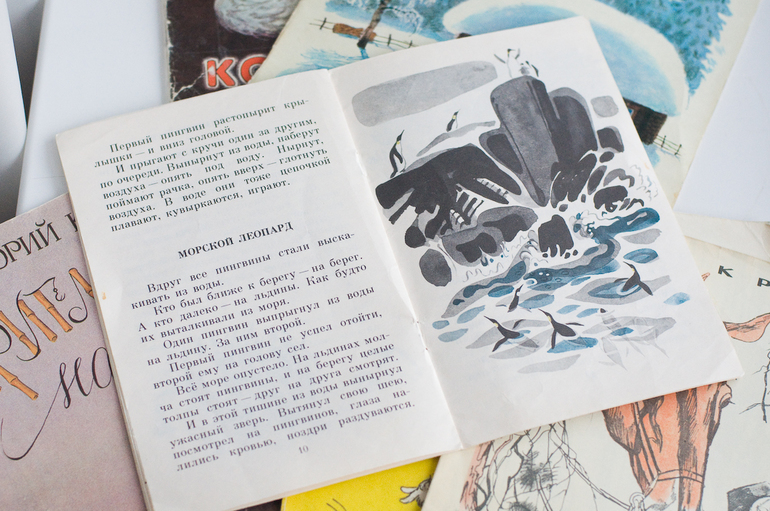 На пингвиньей волне пришлось вытащить и это. Очень рано, сложно, но пару рассказов осилили. Г.Снегирев «Про пингвинов», 1987, Изд-во «детская литература», художник М.Митурич.