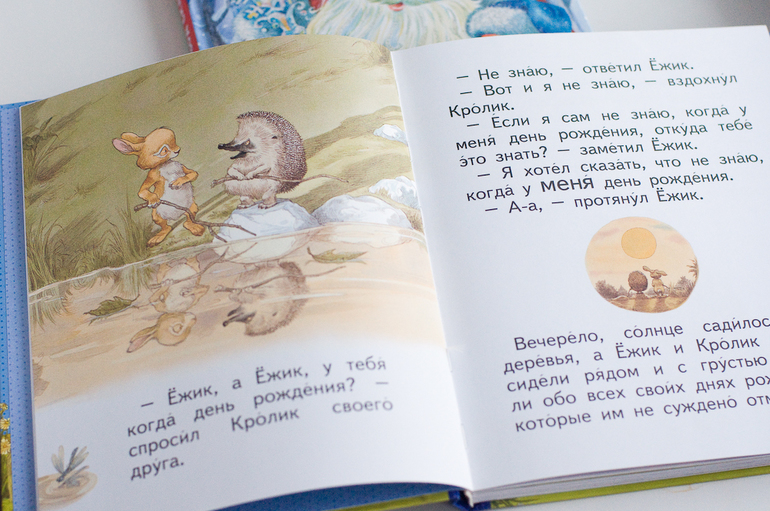 Про День рожденья совсем непонятно. Вот решили звери, что завтра у них Дни рождения, и вот романтичный Ежик собирает для Кролика бутылку лунного света, который Кролик потом выпивает, когда ночью захотелось пить. А Кролик дарит коробку уюта, из которой Ежик делает ловушку для червячков. Мда… Это к тому, что каждый не угадал с подарком, подарил самое важное для себя, которое не оценил друг? Мораль странная. Может позже вернемся, а пока что-то никак.