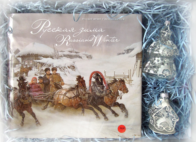 Идеальный новогодний подарок для ценителей живописи. В ясные морозные дни хорошо с чашкой чая погружаться в атмосферу праздника для души, когда снег не только за окном, но еще можно держать в руках целый короб настроения. В альбоме представлены картины Русского музея (Санкт-Петербург). В наборе две чудесные елочные игрушки из стекла.