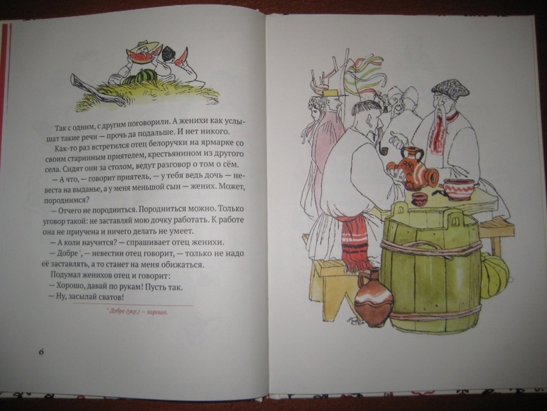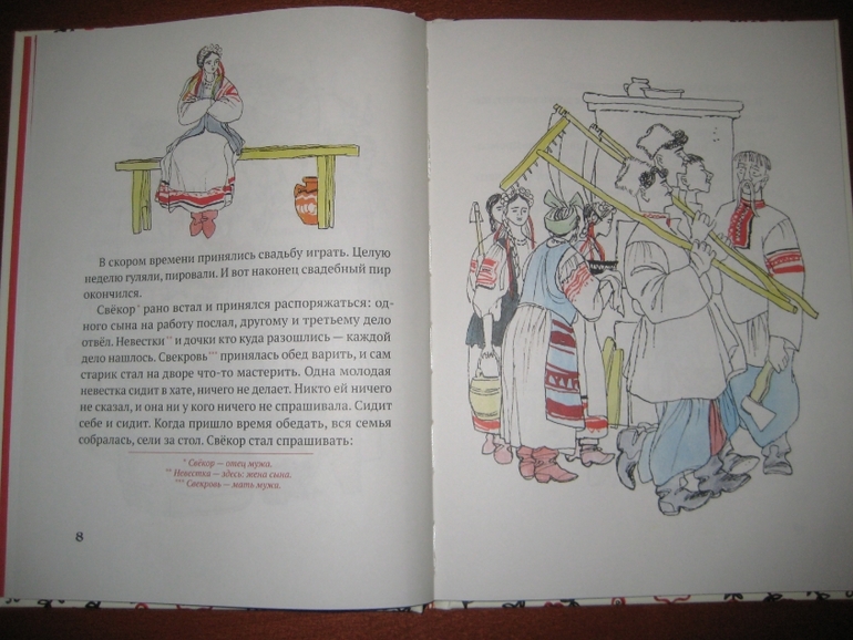 Понравилось, что всем не совсем привычным словам в книжке дается пояснение, в частности, описывается характер родственных связей (свекр, свекровь, зять, золовка, сват), дается толкование украинских слов (добре, доню, тату), предметов одежды (свитка, душегрея) и т.д. Это прямо смело можно считать дополнительным самостоятельным бонусом - возможность мимоходом существенно пополнить словарный запас :)