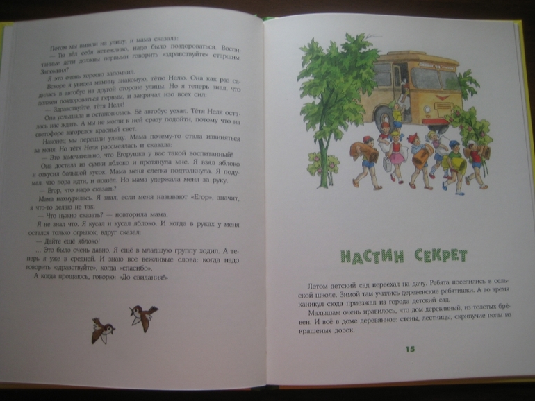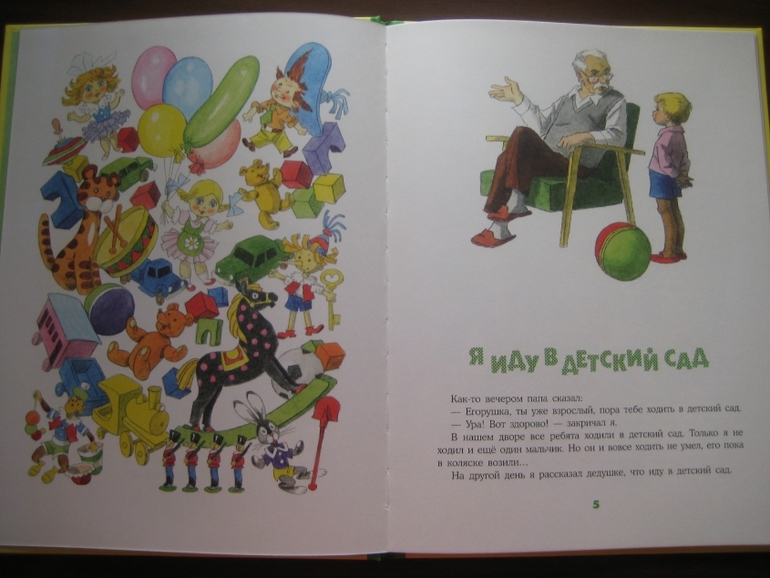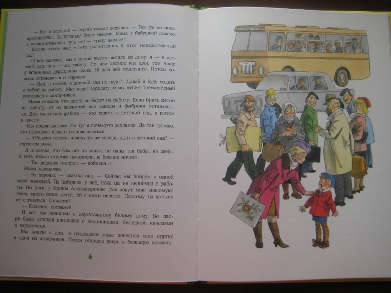 Вот, например, идет Егорушка в первый раз в детский сад. И чем дальше, тем все больше замедляются его шаги, все слабее и слабее его решимость и готовность к переменам... Там ведь "заступаться будет некому. Мама с бабушкой далеко, а воспитатели чуть что - сразу накажут". Знакомо, правда? Ох, как мне не хотелось первую неделю идти в детский сад... Это уж потом появилось много друзей и оказалось, что в саду можно очень даже весело проводить время, например, ставить спектакли и выбрать себе роль прекрасной Констанции, а поначалу было достаточно грустно.
