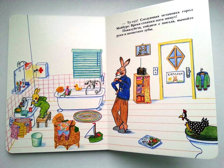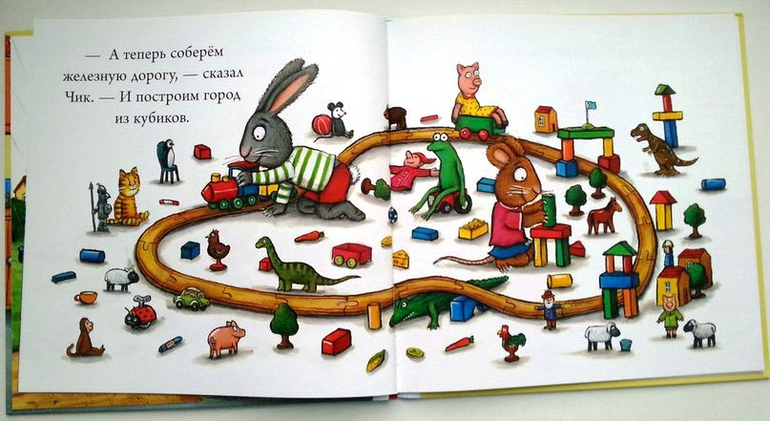 Из трех книжек приглянулась Лужица. Чик и Брики заигрались, и зайчик случайно сделал лужицу. Мои малышии сами еще порой так делают, а здесь с удовольствием повоспитывали зайца. Много здесь нарисова но детских игр. Больше всего мы разглядываем железную дорогу, даже сами стали строить ее из лего.