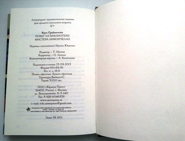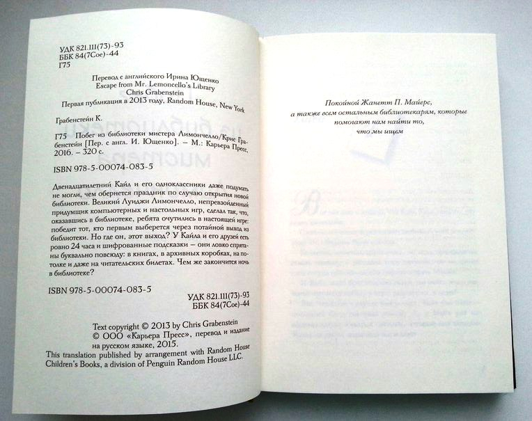 Грабенстейн Крис . Побег из библиотеки мистера Лимончелло. Книга с первой же главы захватывает все внимание и держит в напряжение. Бумага офсет, шероховатый, желтоватый, просвечивает. Иллюстраций нет. Жду еще книг этого автора