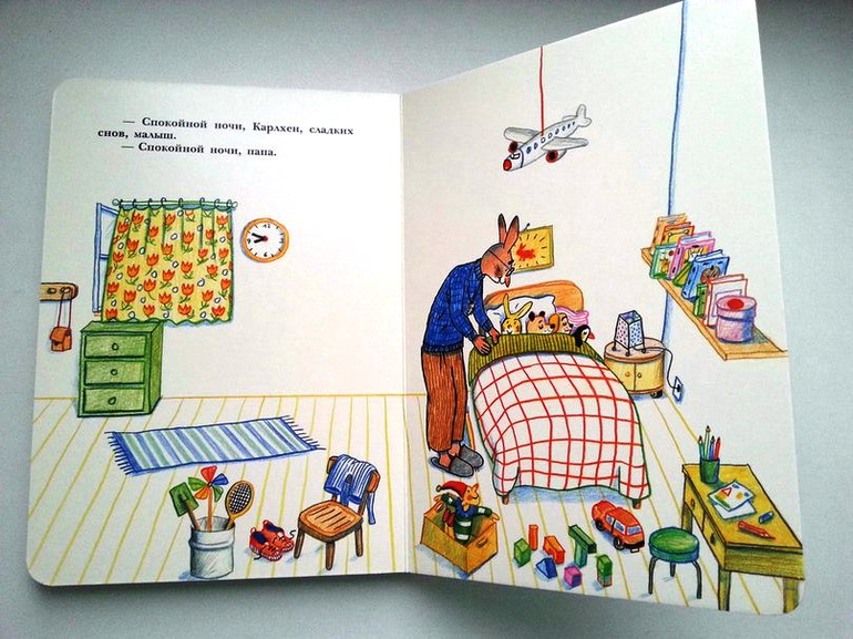 "Спокойной ночи, Карлхен". Малыш не хочет спать. И папа придумывает игру - тапочковый скоростной поезд, где машинистом является он сам, а Карлхен становится пасссажиром. Поезд отправляется по станциям. Морковьбург, где мама угощает вкусной морковкой, желает сладких снов. Мойбург, где зайчик умывается и чистит зубки. Спибург, где малыша необычно доставляет папа в кровать.