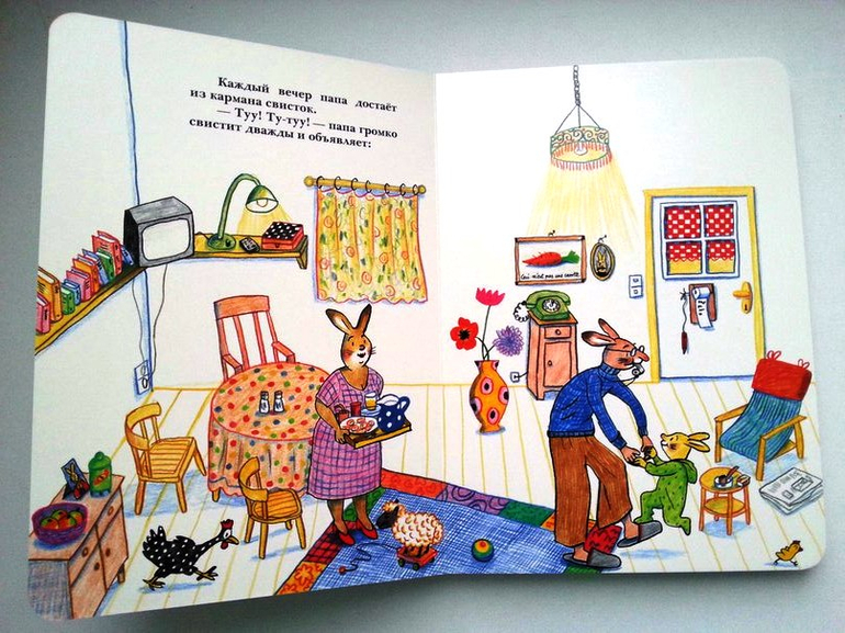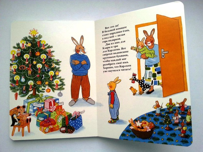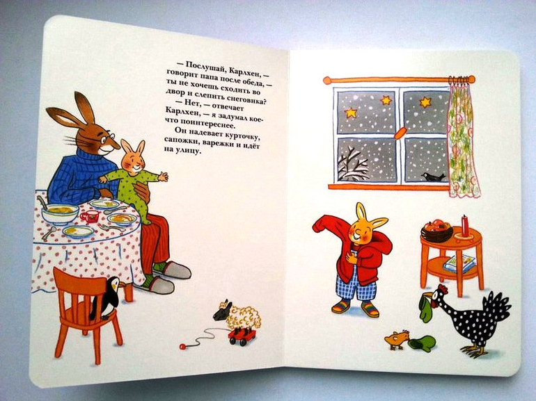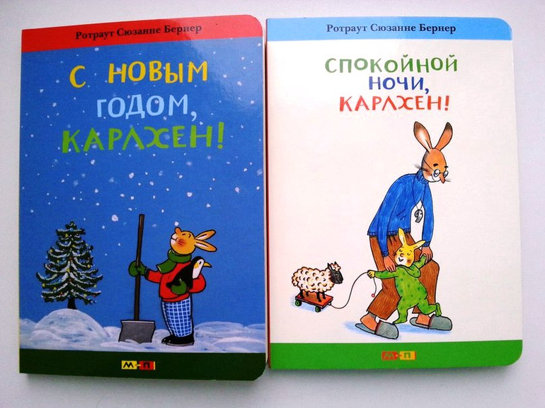 Хит декабря у малышни серия книг про зайчонка КарлхенСюзанны Бернер. Книжки-картонки, с закругленными краями страниц, небольшого формата, идеально помещаются в ладошках детей. Сюжеты интересные, поучительные. Многое можно принять к действию по этим книжкам. Параллельно с жизнью семьи зайцев художник нарисовал и жизнь курицы с цыпленком. Забавные истории можно сочинить по ним с ребенком. Моим малышам эти книги приглянулись еще и по тому, что здесь главным героем является Папа. Не везде это можно встретить. Они так и говорят: "Читай папу".