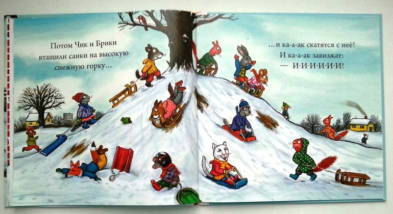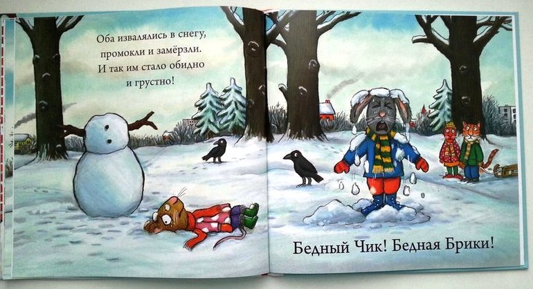 Снеговик тоже был любим. Снега тогда еще не было, а на санках хотелось кататься. Много тут зимних забав: и санки, и коньки, и снеговик, и снежки. На снеговике Чик и Брики поссорились, закидали друг друга снежками, расплакались. А потом мило помирились и извинились друг перед другом. Мне понравилось описание, когда герои одеваются. Зимой много одежды, и не все дети любят ее надевать.